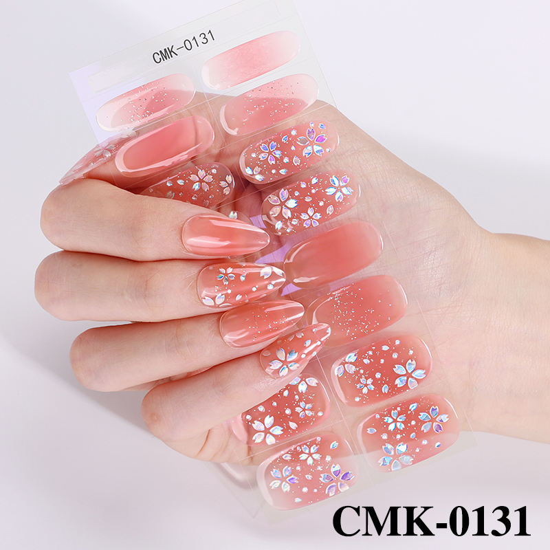 Gel Strips mit Pfirsich-Rosa-Verlauf, holographischen Kirschblüten und Glitzerpartikeln.