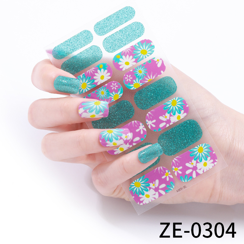 Verspielte Nail Wraps mit bunten Blumen und Glitzer in Türkis, Pink, Weiß und Gelb.