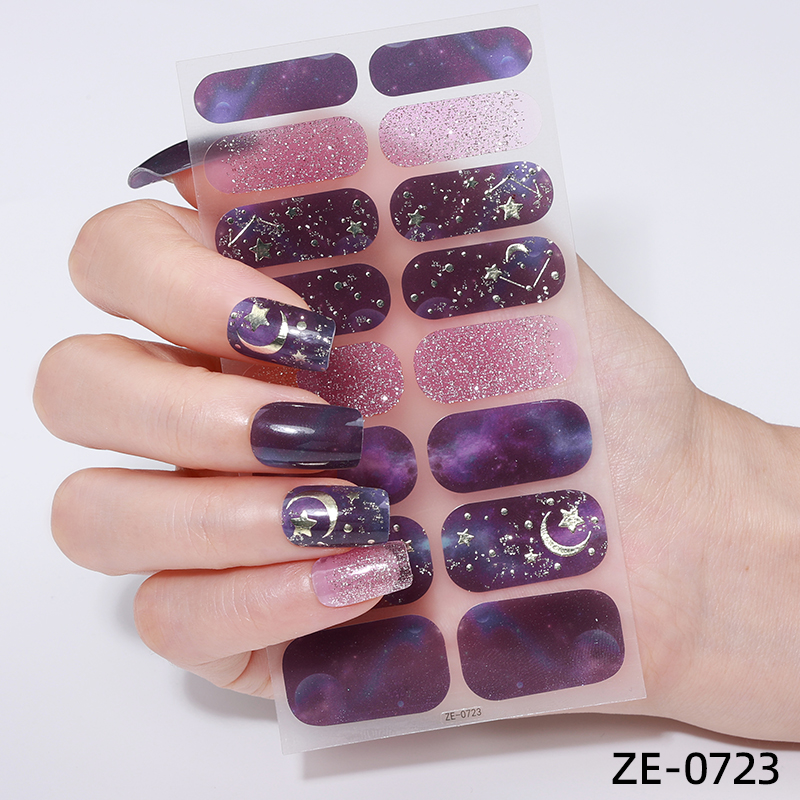 Glamouröse Nail Wraps mit Sternenhimmel in Lila, Dunkelblau, Rosa, Gold und Silber.