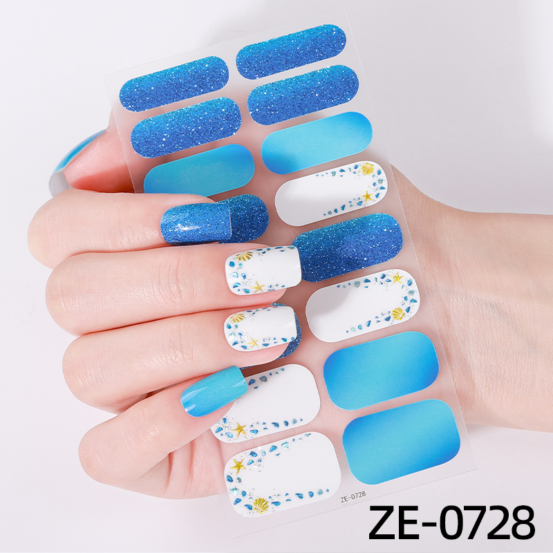 Verspielte Nail Wraps mit Muschelmotiven und Glitzer in Blau, Weiß, Gold und Türkis.