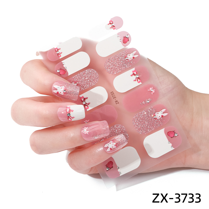 Verspielte Nail Wraps mit süßen Tiermotiven in Grün, Weiß und Rot.